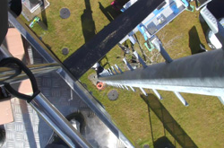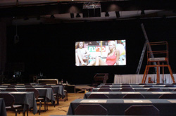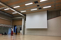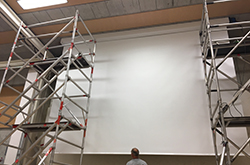 Installazione schermo di proiezione motorizzato di 5.75 x 4.00 m per un peso di 200kg, a 6 metri di altezza.
